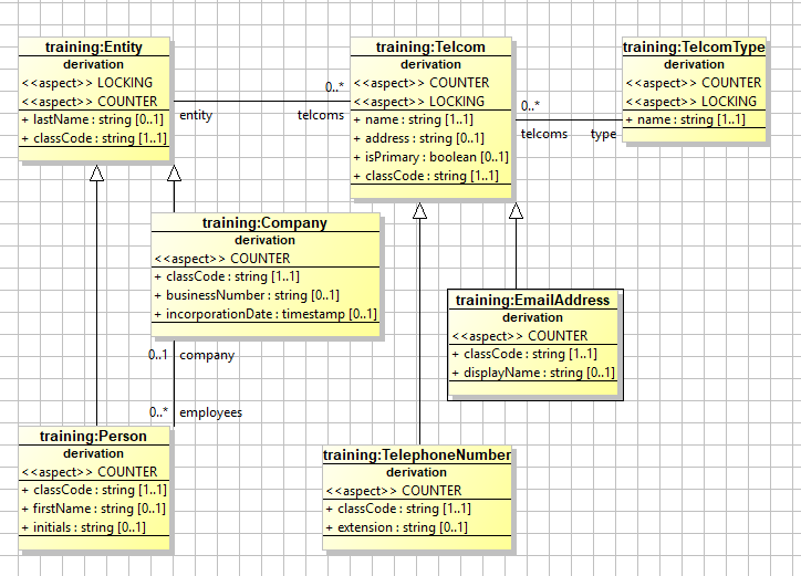 You need to specify that training:Person is based on the training:Entity class, and add the attributes specific to training:Person. One of the attributes you add is classCode, that will be used to identify the type of class that a given instance belongs to. Later, you use classCode to control interactions between some of the class instances.