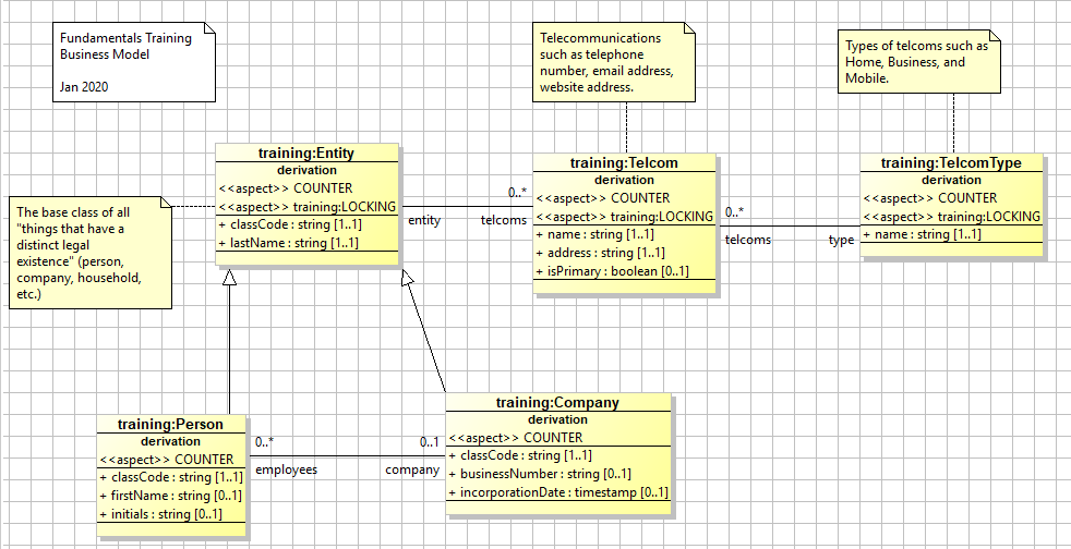 Here, we extend the training:Entity model by creating two new classes: training:Person and training:Companytraining:Company will have a 0-to-many association with training:Person: each person can have only one associated company but each company can have any number of associated people as employees.