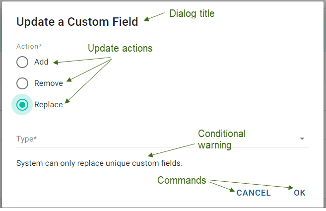 In batch update dialogs, use the radio buttons specify the possible update actions. At least one is required. The supported actions depend on the functionality of the dialog. In general, Add, Remove, and Replace are the most common actions. Once the action is selected, the fields or interface text associated with the specific action is displayed. For example, the Add action in the Update a Custom Field dialog has 2 fields the user must complete (Type and Value). However, the Remove and Replace actions on the same dialog only have 1 field (Type).