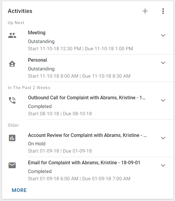 If there are additional items that can be displayed in the list, then the MORE button is displayed on the bottom left of the card. Optionally, the VIEW ALL button is displayed on the bottom right of the card.