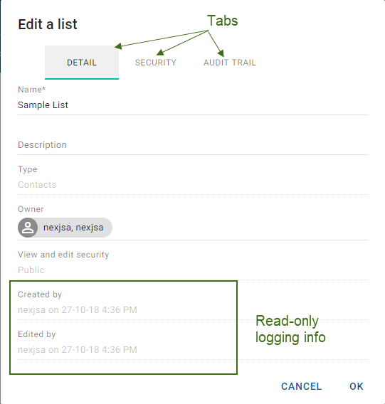 In edit dialogs, you should include create and update logging info (user ID and timestamp) where available.