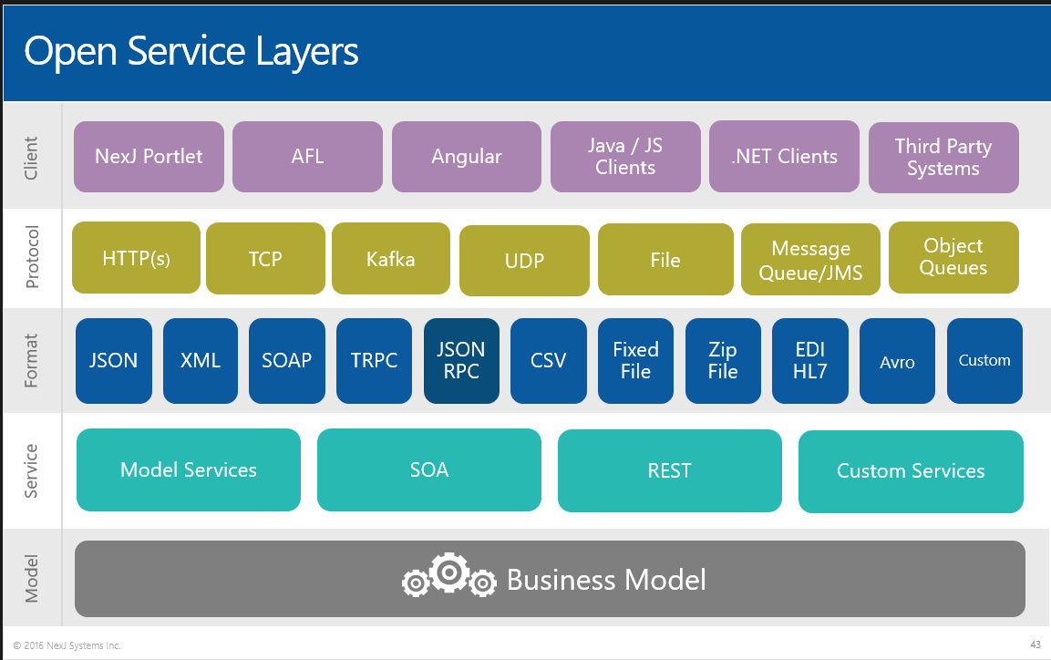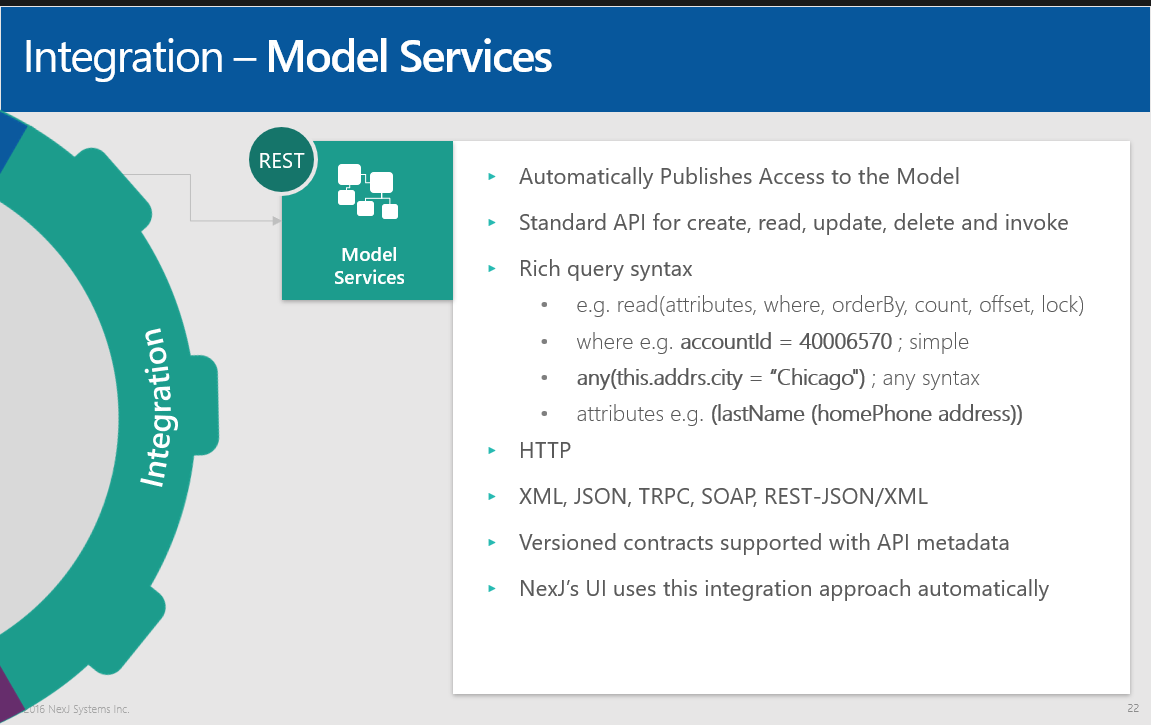 • Model Services (REST) provide secure API access to the business model automatically (public methods and attributes) over HTTP(s). It is available as XML, SOAP, JSON, and REST interactions from any HTTP-capable client, including Javascript libraries, .NET, and Java applications. These are the services used by NexJ’s UI. A mechanism to provide versioned contracts over this API is also available to better support micro-service development and continuous integration. The capabilities of the REST interface are documented automatically with OpenAPI.