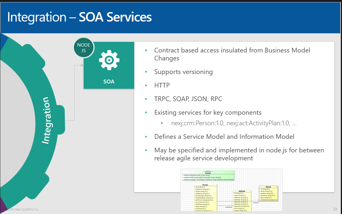 • SOA Services provide contract-based web services to integrate with client enterprise SOA standards. This approach insulates services from business model changes between releases and provides versioning support. It is available over HTTP(s) using SOAP or JSON-RPC. These services may also be implemented in NodeJS for agile service development between releases. The behaviour of the contract interfaces is protected between releases, until the version is retired or deprecated.