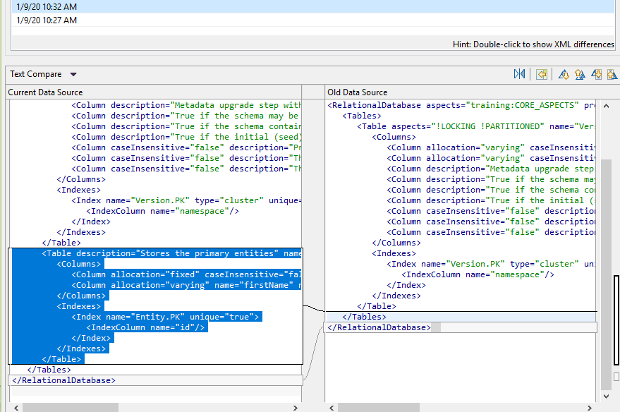 NexJ Studio can create the upgrade steps by comparing the current version of the model to an earlier version of the model. In this case, compare your changes (that is, the addition of the Version table) to a published model or local history.