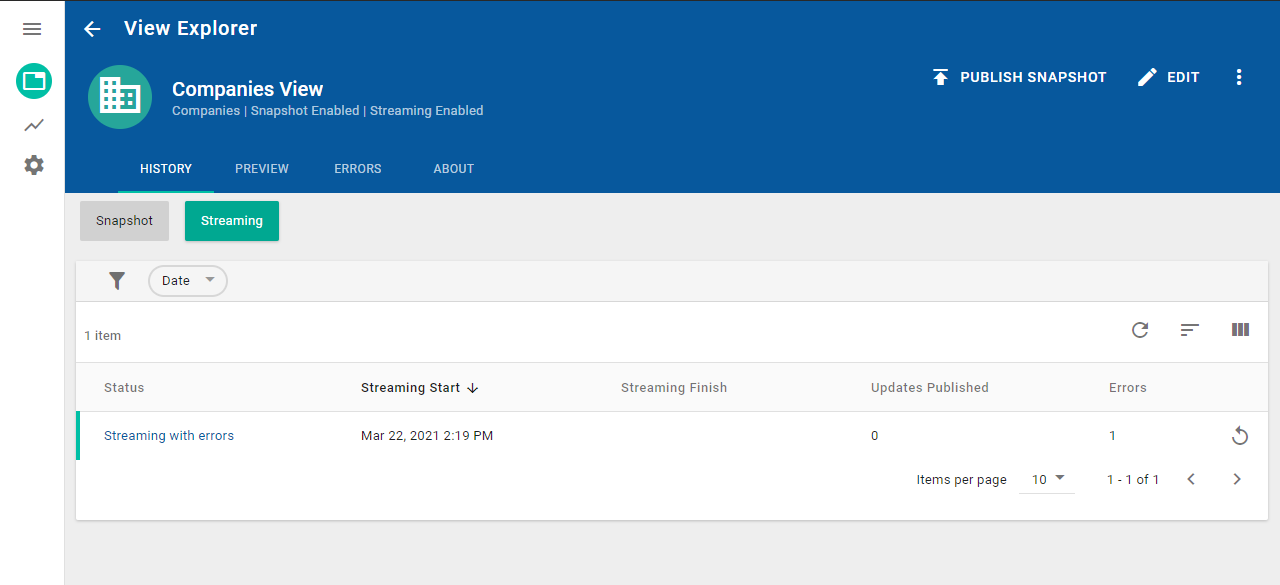 There will be only one occurrence of "Streaming." All other rows will show "Stopped."Streaming Start - displays the date and time when you enabled streaming for this view (you can sort the column in ascending or descending order by clicking the arrow button)
